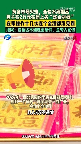 最近一年多鼎盛配资,金价持续暴涨,让越来越多的人将目光投向黄金市场。湖北襄阳的李先生也想攒点金,就在此时他无意中看到一家公司的“炼金设备”广告:“无需经验,一键操作,废旧材料就能炼黄金,月入5万不是梦!”心动的李先生立马联系了商家,花2万买了一套“炼金设备”,可等他在家按照教程,用商家推荐的“废旧原料”反复提炼后傻眼了,别说黄金了,连半点金色物质都没提炼出来。